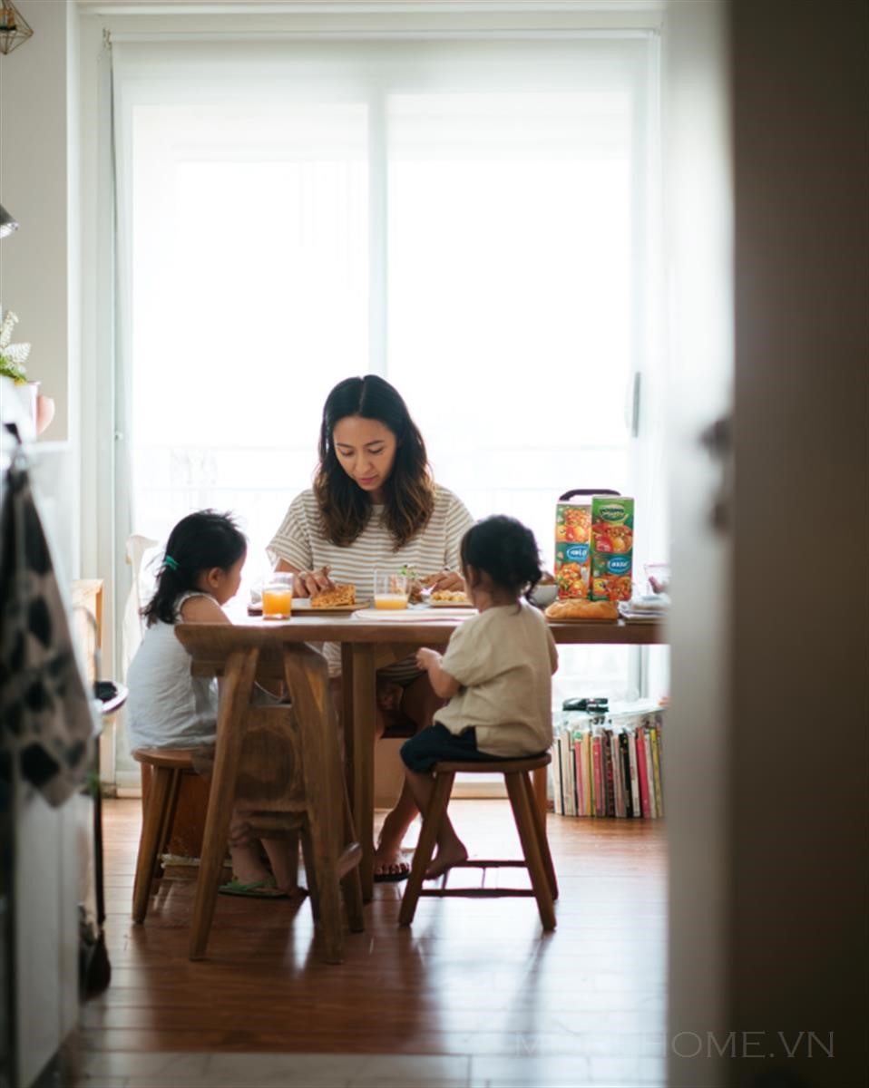 Khung cảnh này không chỉ đơn giản là một buổi sáng gia đình mà còn là một bức tranh về phong cách sống trong những năm tháng hiện đại. Những chi tiết nhỏ như chiếc hộp tetra pack hay bữa sáng giản dị nhưng đầy đủ chất dinh dưỡng là minh chứng cho sự tinh tế trong cách sắp xếp và lựa chọn của người mẹ. Mặc dù không có quá nhiều đồ trang trí, nhưng từng góc nhỏ trong căn bếp vẫn mang đến cảm giác gần gũi, ấm áp và đầy sự chăm sóc. Đây là không gian sống mà mỗi người mẹ đều khao khát xây dựng, nơi mà những phút giây thư giãn và sự quan tâm dành cho gia đình là trên hết.