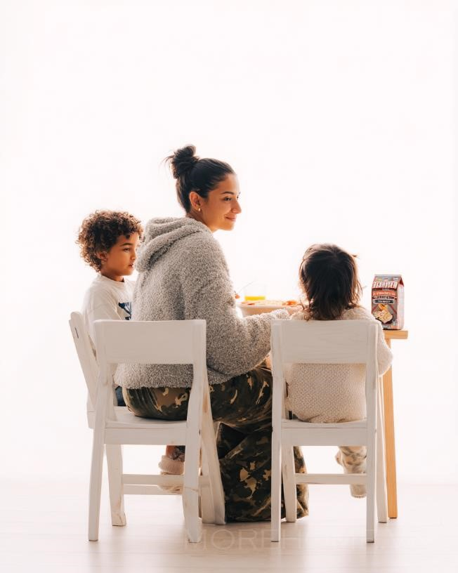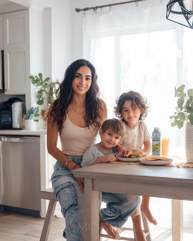 Trong một không gian bếp đơn giản nhưng đầy phong cách, ánh sáng mềm mại chiếu qua cửa sổ tạo nên một bức tranh sống động về sự ấm cúng và tình cảm gia đình. Một người mẹ Latina ngồi tựa lưng vào chiếc bàn ăn hiện đại, xung quanh là những đứa trẻ nhỏ đang vui vẻ trò chuyện. Trên bàn, một hộp tetra pack nhỏ nằm cạnh bữa sáng đơn giản nhưng đầy đủ, như một phần không thể thiếu trong những buổi sáng thường nhật. Màu trắng tinh khôi của nền bếp càng làm nổi bật lên dáng vẻ mềm mại, nhẹ nhàng của người mẹ đang chăm chú quan sát các con mình.