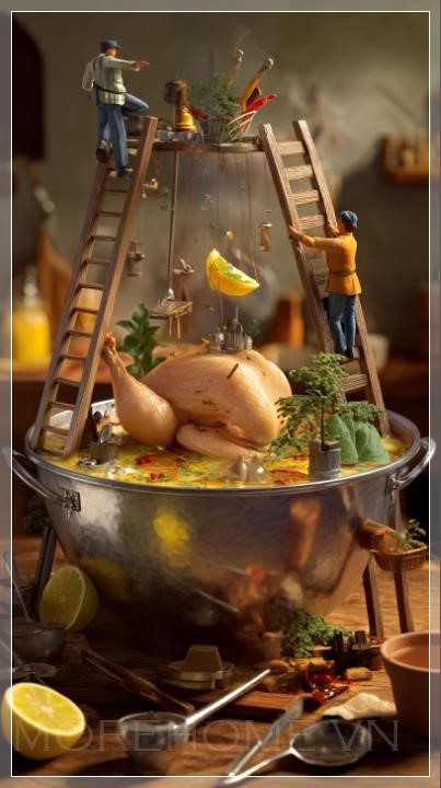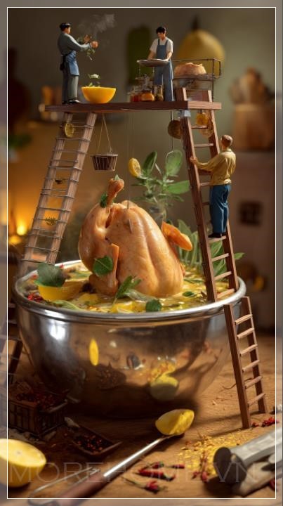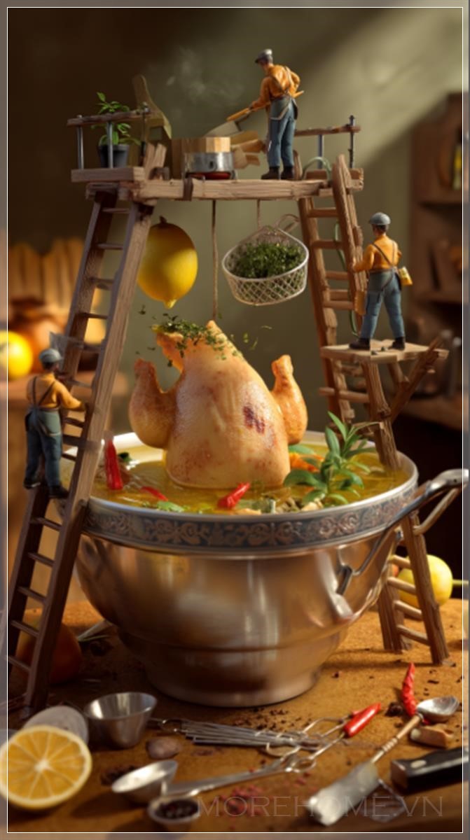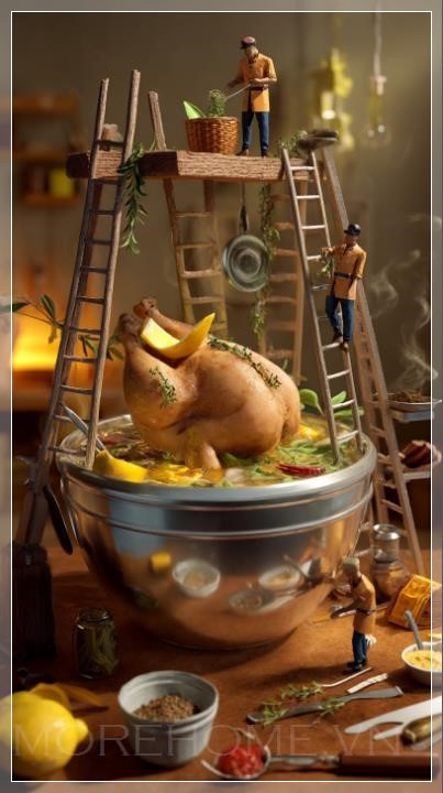 Thiết kế bếp này không chỉ thu hút người nhìn bởi hình ảnh 3D độc đáo mà còn bởi cách thức mà các vật dụng trong không gian được sử dụng để tăng cường cảm giác gần gũi và thân thiện. Những nhân vật tí hon đứng trên thang và giàn giáo để chế biến những miếng thịt gà khổng lồ, rưới lên đó hỗn hợp sữa chua, nghệ và ớt đỏ. Một công nhân nhỏ khác trượt xuống lát chanh như một chiếc cầu trượt, tạo ra một khung cảnh vừa vui nhộn lại vừa đầy tính nghệ thuật. Những chiếc thùng gia vị nổi lên trong không khí, tạo ra một sự chuyển động nhẹ nhàng, hài hòa, mang lại một không gian bếp sống động như trong một bộ phim điện ảnh.