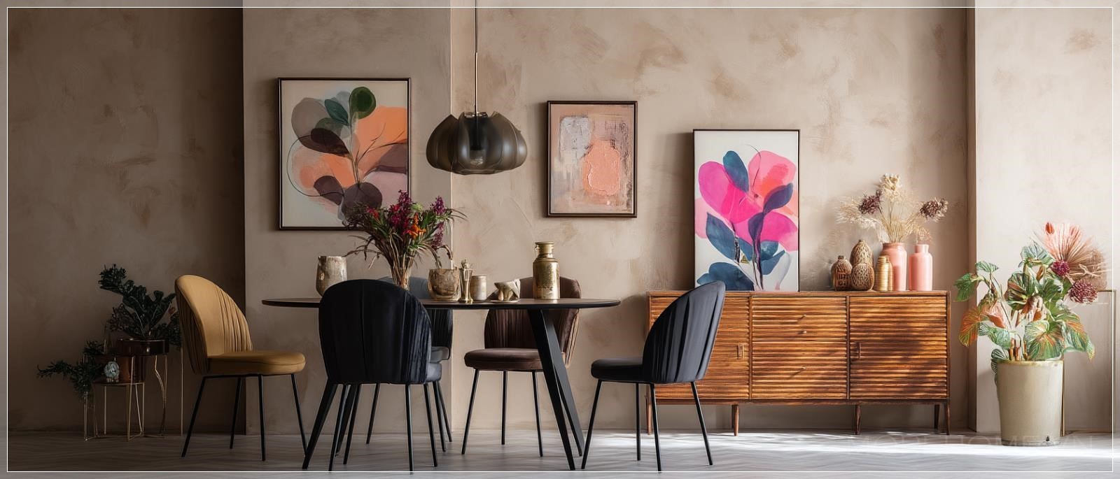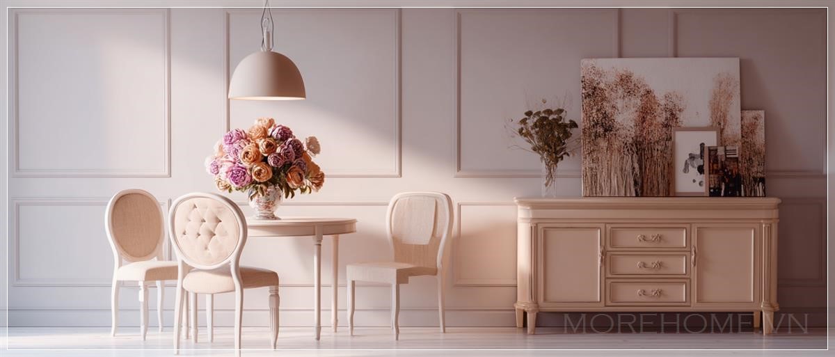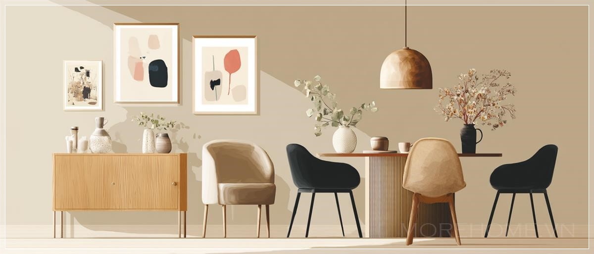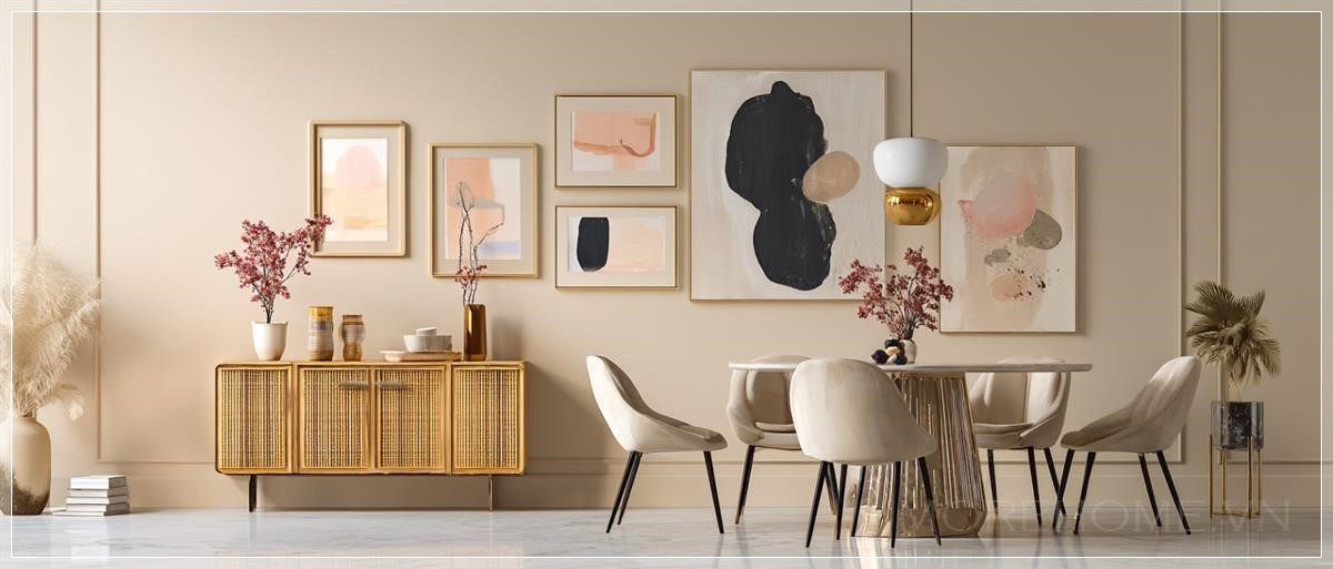 Với sự kết hợp tinh tế giữa màu sắc nhẹ nhàng và những chi tiết trang trí sáng tạo, không gian phòng ăn trở thành một phần quan trọng trong việc thể hiện cá tính và gu thẩm mỹ của gia chủ. Trong bài viết này, chúng ta sẽ cùng khám phá một thiết kế phòng ăn hiện đại với tông màu be, nơi các yếu tố như ghế thiết kế, đèn treo, hoa trong bình, tranh vẽ và các vật dụng trang trí được kết hợp một cách khéo léo để tạo nên một không gian vừa thanh lịch vừa ấm cúng.