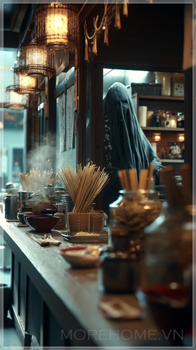 Với hình dáng mảnh mai, dài và bay lượn, thân thể của Ittanmomen giống như một làn sóng bay theo gió, như một sự hòa quyện hoàn hảo giữa huyền bí và thực tế. Nó đứng sau quầy bếp, nơi những bát soba đang được đun sôi trong nước sôi. Cảnh tượng này không chỉ gợi lên cảm giác ấm áp mà còn truyền tải một cảm giác cổ kính, mộc mạc. Hình ảnh này được ghi lại từ góc nhìn ngang tầm mắt, cho phép người xem cảm nhận được sự chân thực đến mức như có thể bước vào chính không gian đó.