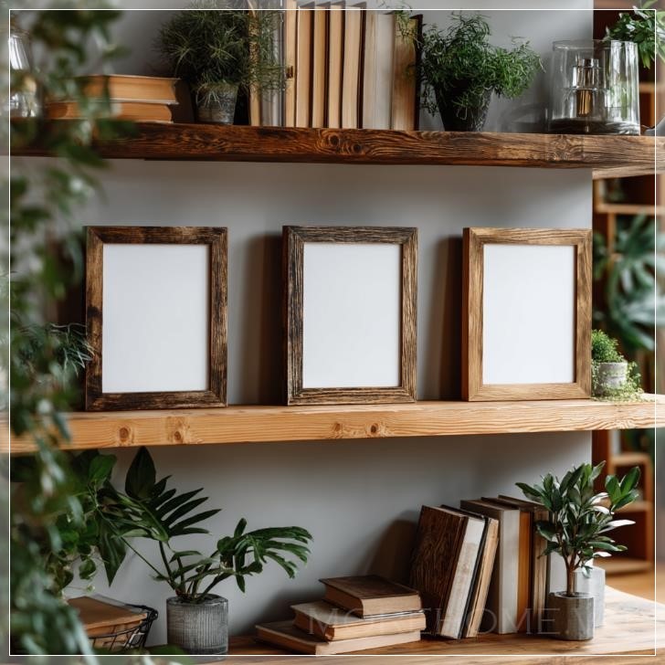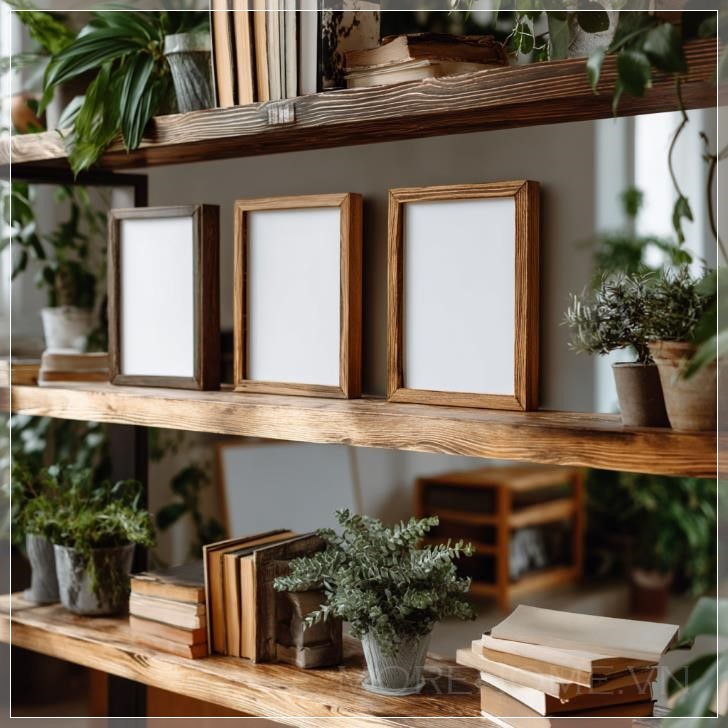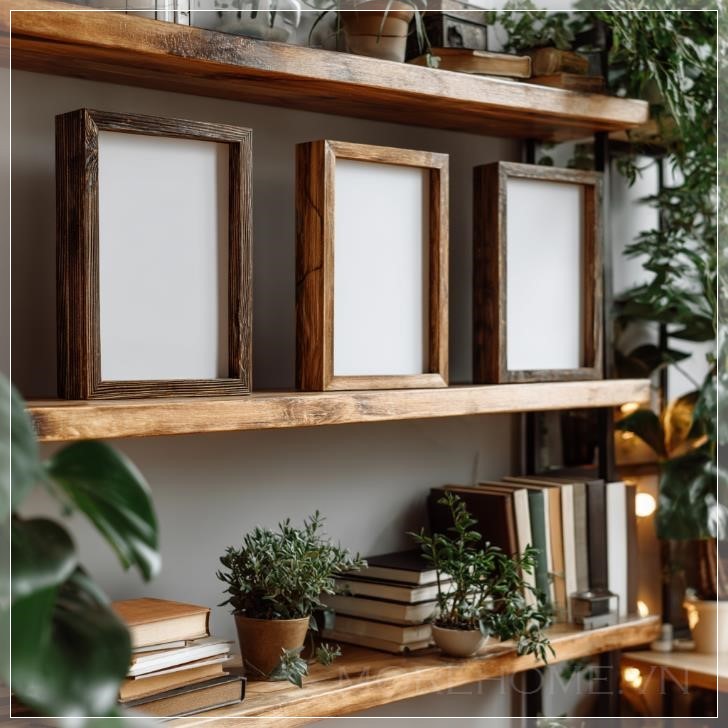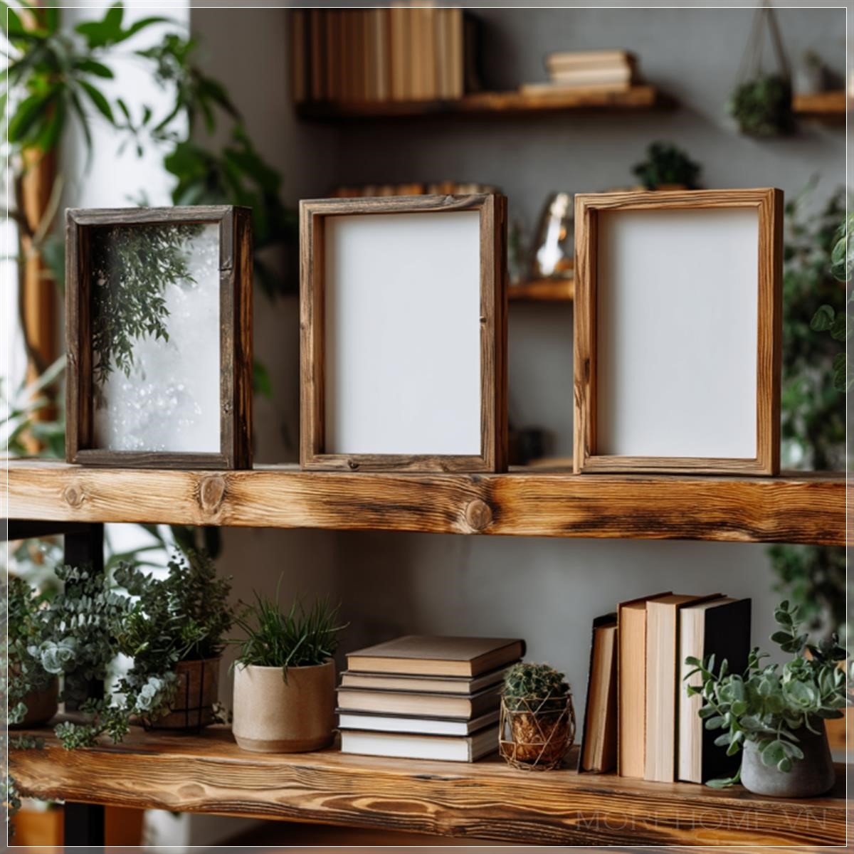 Ba khung ảnh gỗ, với những bức tranh trắng tinh, được đặt trên một chiếc kệ gỗ sáng màu, tạo ra một không gian nhẹ nhàng và thanh thoát. Điều đặc biệt là sự chọn lựa màu sắc và vật liệu của kệ và khung ảnh, khi kết hợp với màu gỗ sáng tự nhiên, tạo cảm giác thân thiện và dễ chịu cho người nhìn. Đặt những khung ảnh này trong một không gian ấm cúng không chỉ là cách làm đẹp cho căn phòng, mà còn là cách tạo ra một không gian thư giãn hoàn hảo.