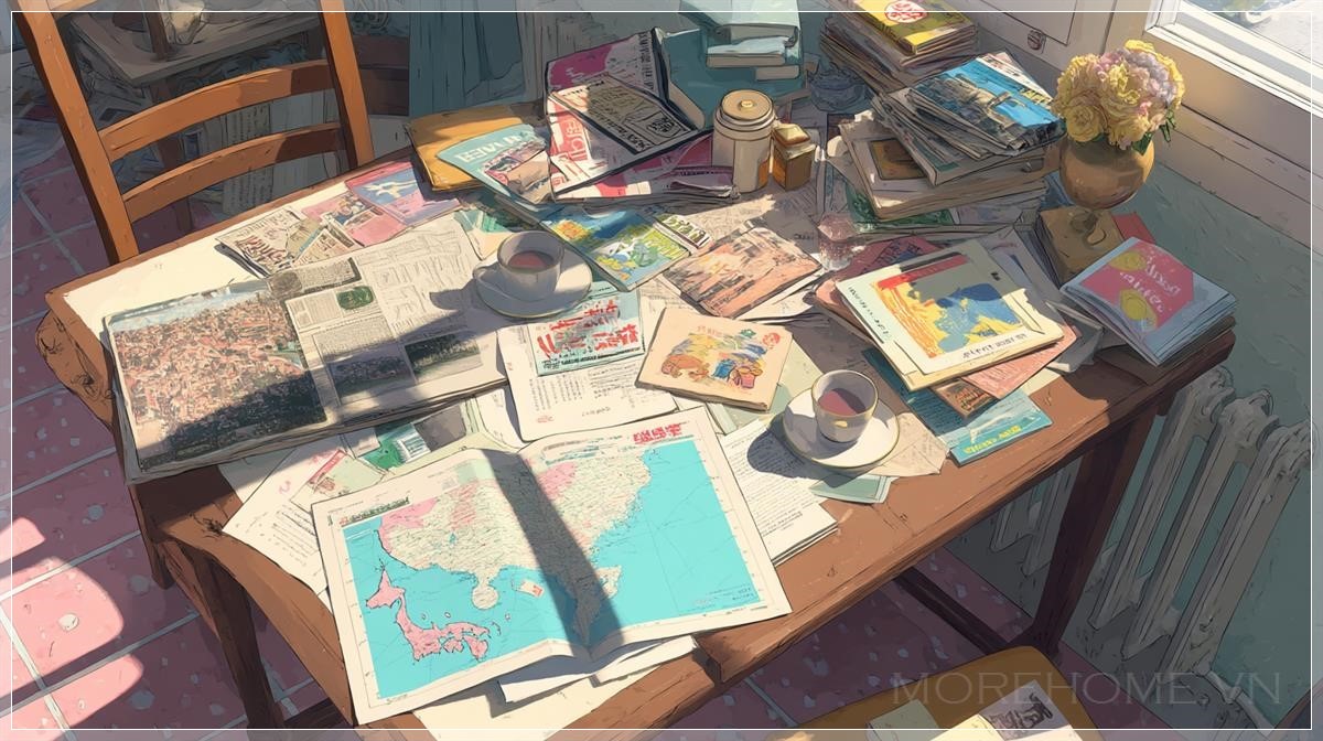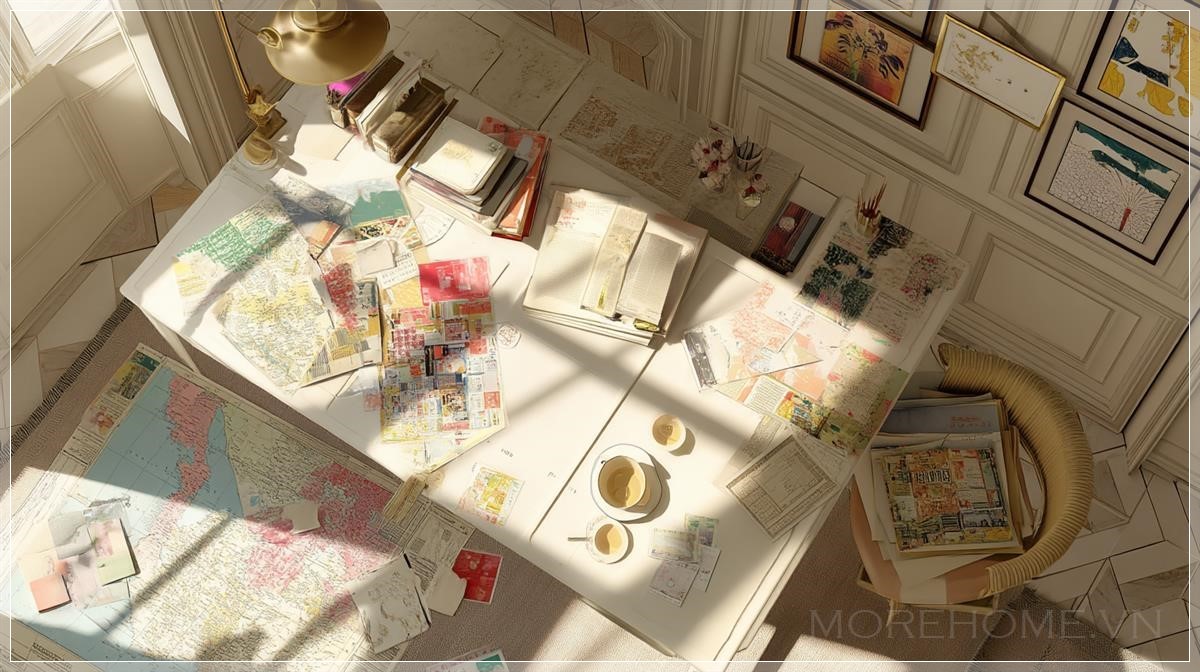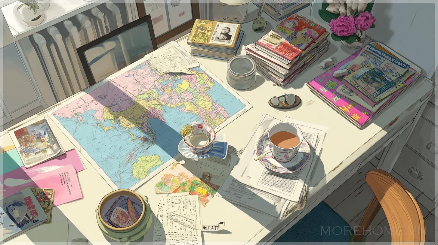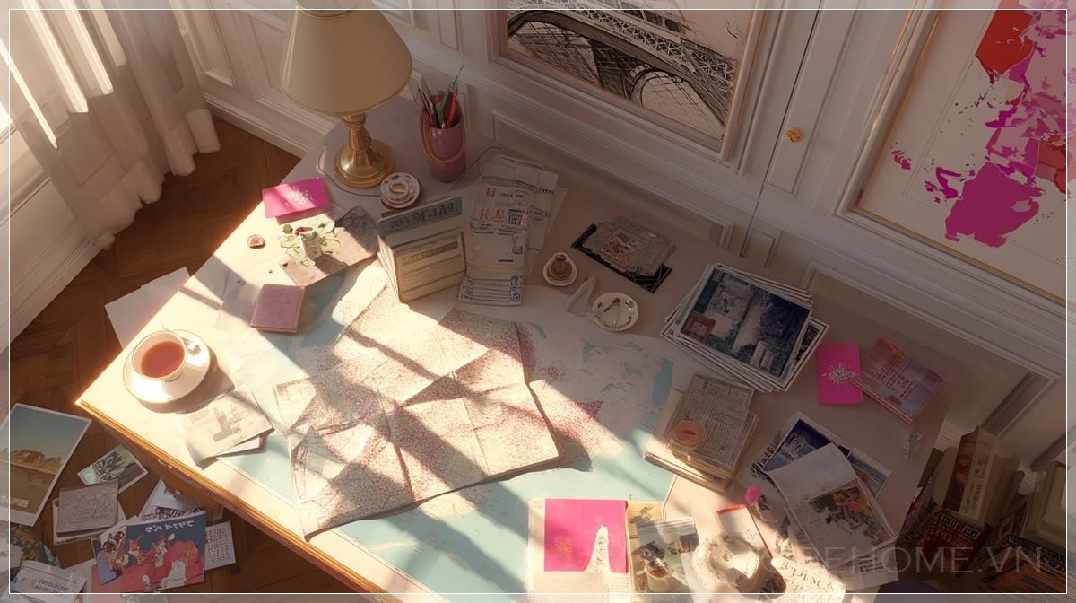 Có điều gì đó đặc biệt khi ta nhìn xuống một căn phòng từ góc độ trên cao – đặc biệt là khi căn phòng đó thuộc về Paris những năm cuối thế kỷ 20, nơi mà mỗi chi tiết nhỏ đều là một dấu ấn nghệ thuật. Trong bức tranh mang đậm tính chân thực này, ánh sáng mặt trời nhẹ nhàng tràn vào, nhuộm không gian trong sắc vàng dịu, tôn lên các tông màu be, trắng ngà và trắng tinh khôi vốn đã tạo nên vẻ thanh lịch đặc trưng. Ở chính giữa là chiếc bàn làm việc cổ điển, bừa bộn một cách có chủ đích với những tờ giấy đầy màu sắc, tạp chí mở sẵn, ly sứ trắng và một bản đồ Nhật Bản minh họa sống động. Không gian ấy vừa thân quen, vừa khơi gợi cảm giác tò mò như đang lật mở một chương sách nghệ thuật cá nhân.