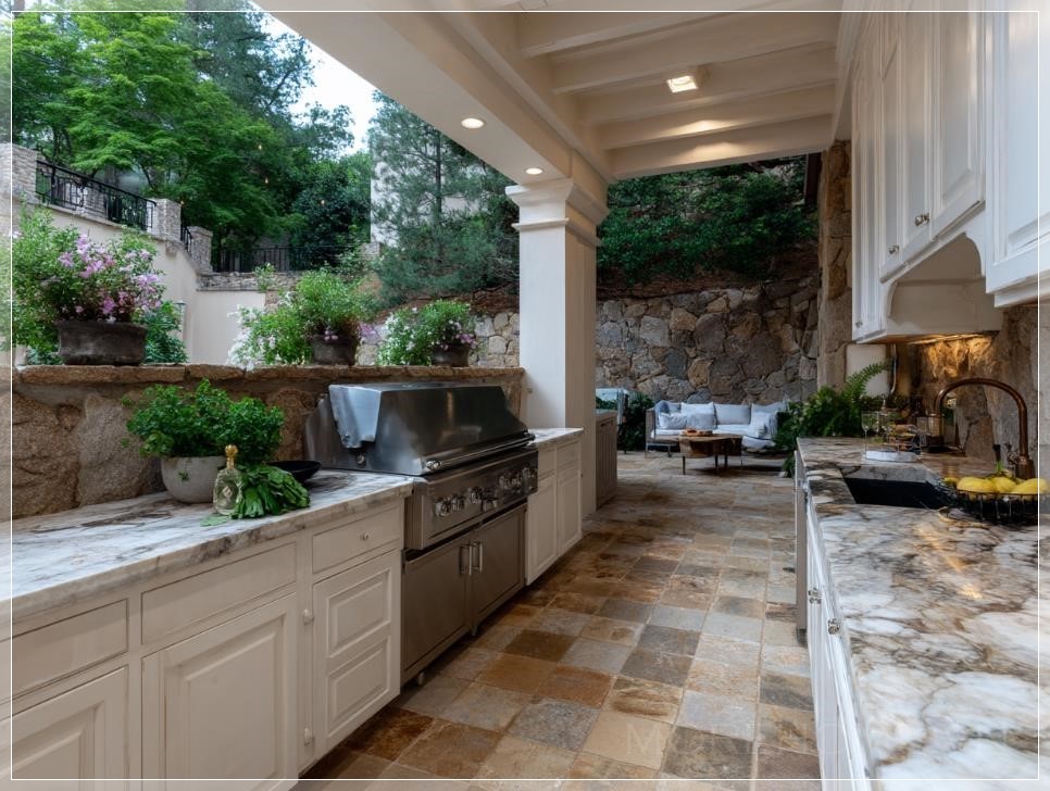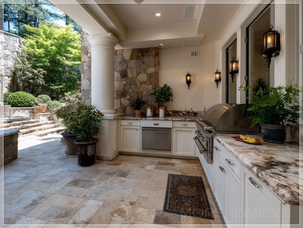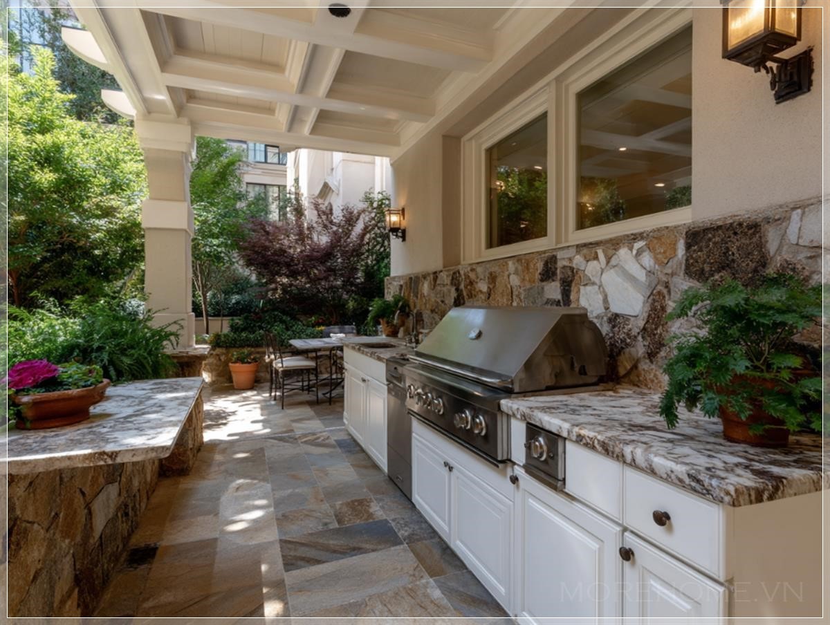 Được đặt dưới một mái hiên trắng, không gian bếp này không chỉ đáp ứng nhu cầu nấu nướng mà còn là nơi lý tưởng để thư giãn. Mặt bàn đá marble sang trọng kết hợp với các bức tường và sàn đá tự nhiên mang lại cảm giác vững chắc và thanh thoát. Từ một khu vực bếp rộng rãi, bạn có thể nhìn ra toàn cảnh khu vườn xanh mát, hòa mình vào không khí trong lành và tươi mới. Thiết kế này không chỉ giúp tận dụng tối đa không gian ngoài trời mà còn tạo ra một không gian sống kết nối với thiên nhiên, lý tưởng cho những buổi tối quây quần bên gia đình và bạn bè.