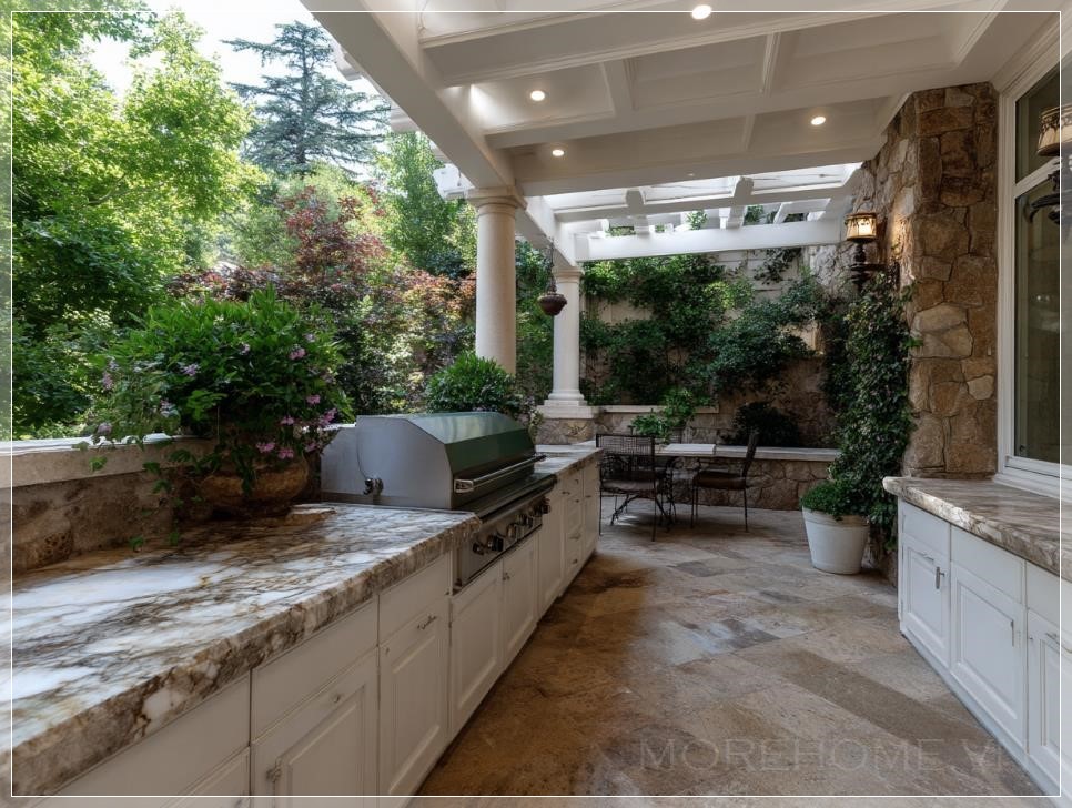 Bếp ngoài trời không chỉ là một không gian để chế biến món ăn mà còn là một phần không thể thiếu của phong cách sống hiện đại. Việc sử dụng đá tự nhiên, đặc biệt là đá marble, không chỉ tạo nên sự sang trọng mà còn giúp không gian bền bỉ, dễ dàng vệ sinh và duy trì lâu dài. Mái hiên trắng tạo ra một điểm nhấn nhẹ nhàng, thanh thoát, đồng thời cung cấp sự che chắn cần thiết trong những ngày mưa hay nắng gắt. Các cột đá được thiết kế tinh tế không chỉ có tác dụng trang trí mà còn hỗ trợ cấu trúc tổng thể của không gian, làm nổi bật vẻ đẹp tự nhiên của từng chi tiết trong thiết kế.