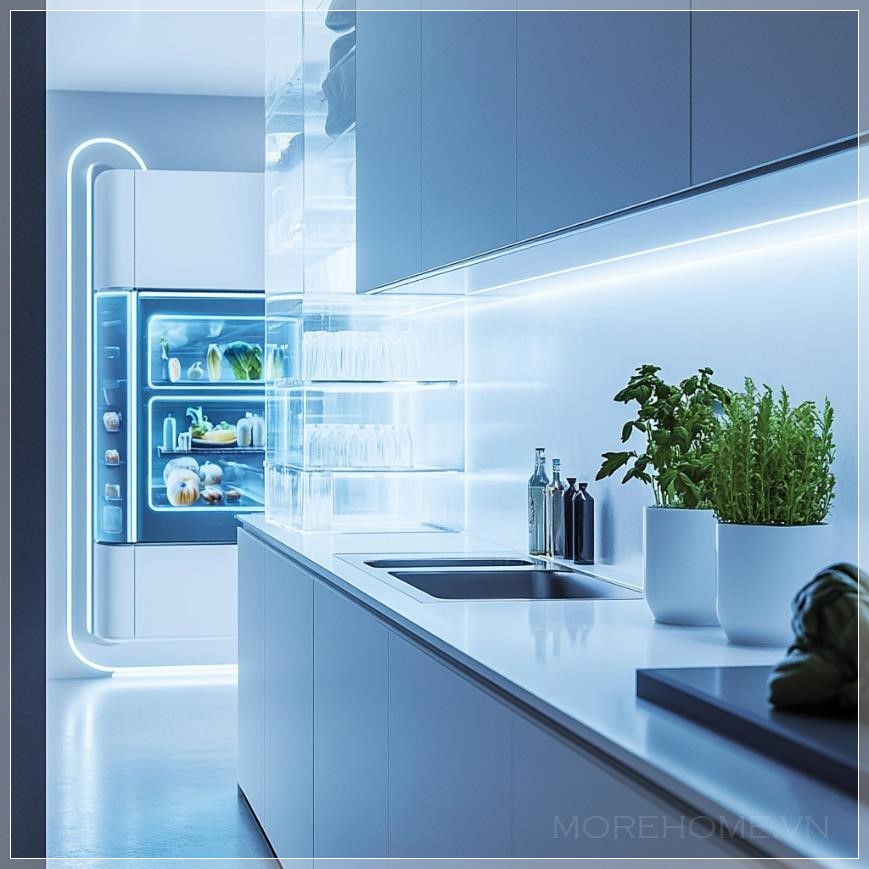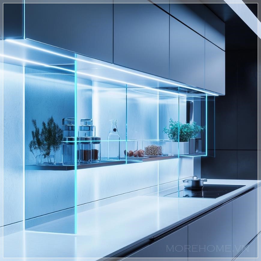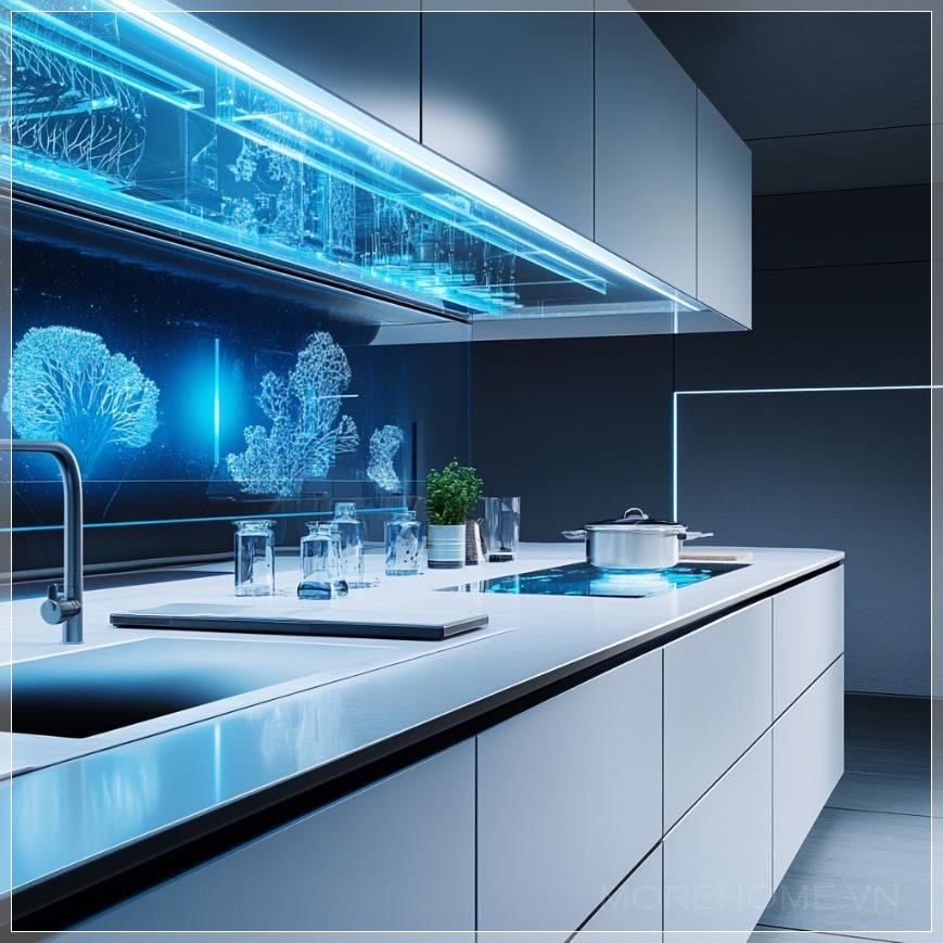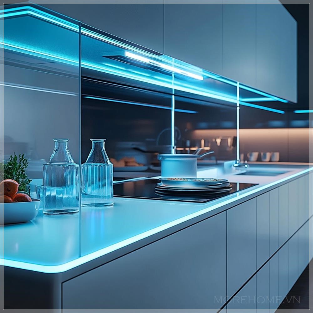 Sự kết hợp giữa tủ bếp OLED trong suốt và không gian bếp hiện đại tạo nên một bức tranh sống động và đầy tính nghệ thuật. Các cạnh tủ bếp được chiếu sáng với ánh sáng trắng lạnh, điểm xuyết bằng các ánh sáng xanh dương rực rỡ, tạo nên một không gian đậm chất công nghệ. Bề mặt của tủ bếp mượt mà và phản chiếu ánh sáng, khiến cho toàn bộ căn bếp như bừng sáng dưới mọi góc nhìn. Điều này không chỉ giúp không gian bếp trở nên hiện đại mà còn tạo ra một không gian rộng mở, thoáng đãng và đầy cảm hứng.