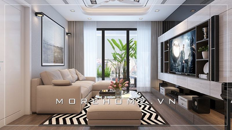 Mẫu sofa phòng khách hiện đại với tone màu kem tạo cảm giác ấm cúng nhẹ nhàng cho không gian ngôi nhà