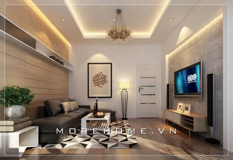 Mẫu kệ tủ gỗ tivi gỗ công nghiệp màu trắng hiện đại, ốp gỗ tường màu nâu độc đáo cho phòng khách chung cư
