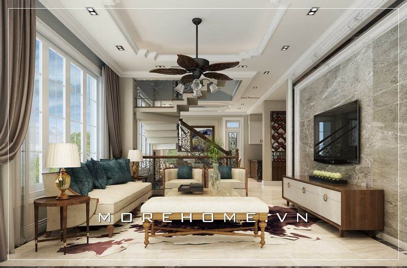 Hệ thống kệ tủ thi công tại phòng khách biệt thự giúp tăng diện tích lưu trữ đồ cho gia chủ