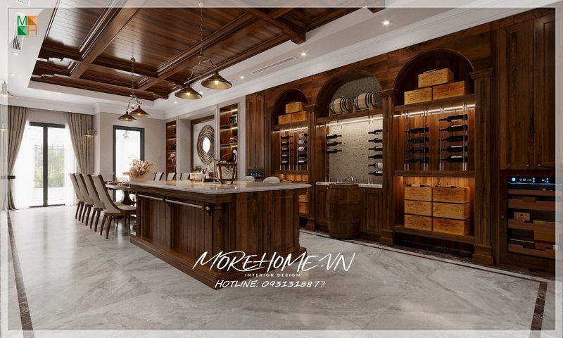 Thiết kế phòng ăn có tủ rượu bằng gỗ óc chó tự nhiên cho phòng ăn biệt thự thêm sang trọng