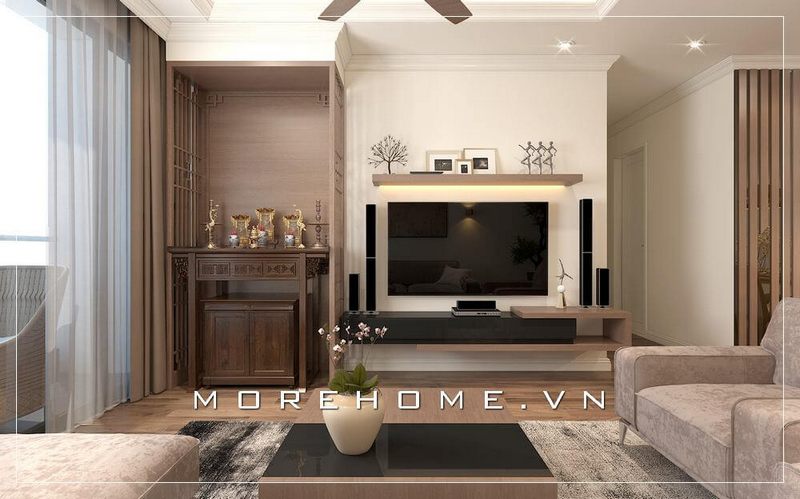 Mẫu bàn thờ chung cư hiện đại với kiểu dáng đơn giản, nhỏ gọn giúp tiết kiệm diện tích không gian căn phòng