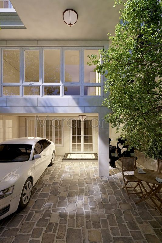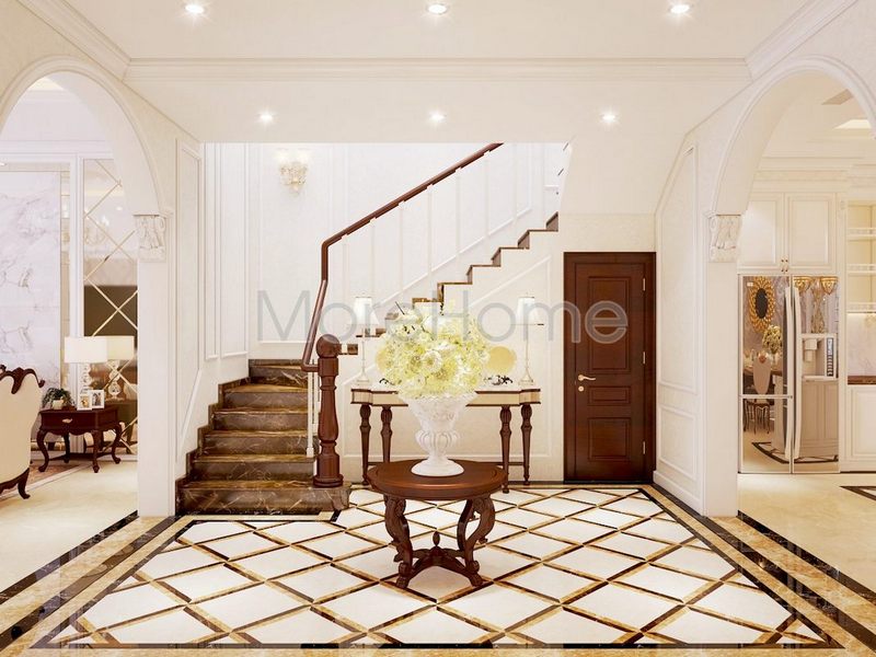Mẫu thiết kế sảnh khách sạn cao cấp nổi bật với nền gạch ốp và tường màu trắng sang trọng