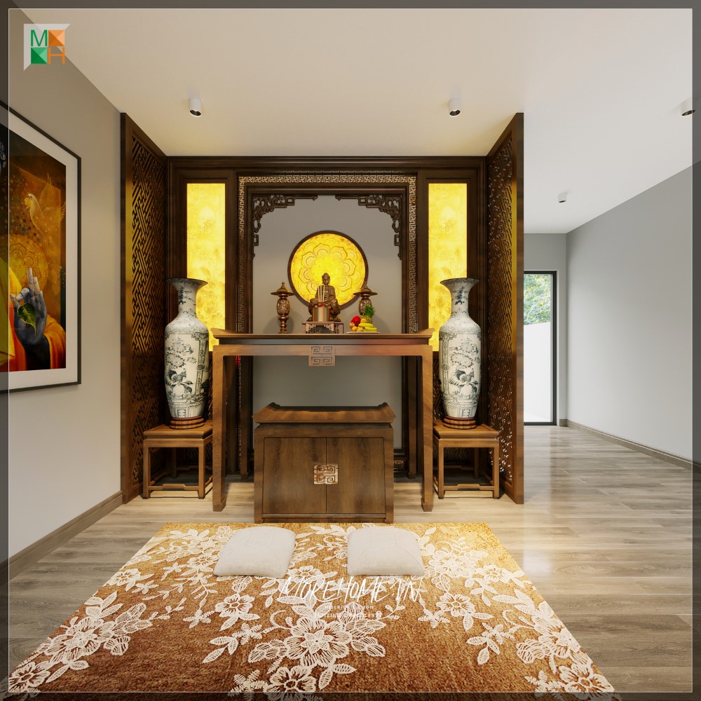 Bố trí nội thất phòng thờ hiện đại, đẹp từ tủ thờ, vách cnc, gỗ ốp, sàn, ghế gỗ óc chó cao cấp.