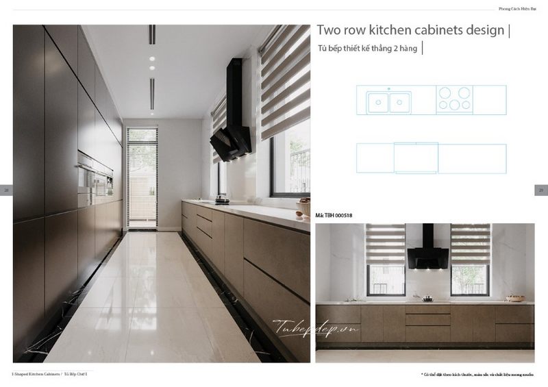 Kiểu thiết kế tủ bếp 2 hàng song đôi với nhau rất tiện lợi để nội trợ và tiết kiệm diện tích cho khu vực bếp biệt thự, nhà phố