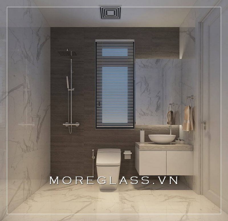 Sử dụng vật liệu kính để thiết kế nội thất phòng tắm hiện đại, giúp không gian phòng trở nên rộng và thoáng hơn.