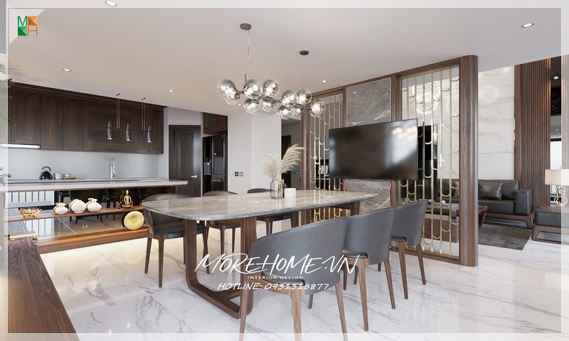 Nội thất phòng ăn chung cư được trang trí theo phong cách hiện đại, tạo ra những ấn tượng sâu sắc.